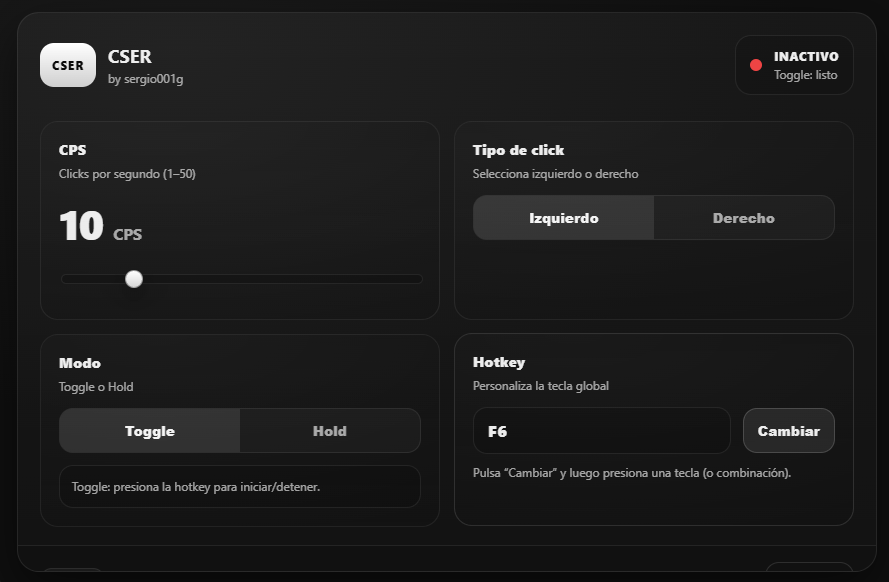 Descarga CSER ahora y experimenta el autoclicking definitivo. Rápido, minimalista, confiable.